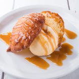 【【テイクアウトOK!!】ハワイのロコスウィーツ「マラサダ」- 3種類】外側はカリッと、内側はふんわりと油で揚げたハワイのロコスイーツ。濃厚キャラメルソースをたっぷりの「キャラメルバニラ340円」、「カスタードメープル290円」、「カスタードバニラ390円」の3種