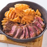 【腹ペコさんに大満足!!ステーキ】ブラックアンガス牛の希少部位ザブトンを使用したジューシーな「ビーフステーキ」、鶏もも肉をソテーし、彩り鮮やかな野菜をゴロゴロ入れたトマトソースをかけた「トマトチキンステーキ」、豚の肩ロースを、生姜を効かせたテリヤキソースで焼き上げた「ポークジンジャーステーキ」の3種